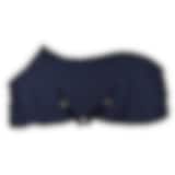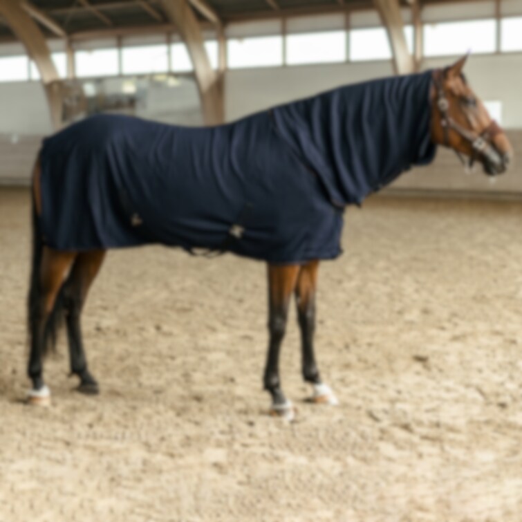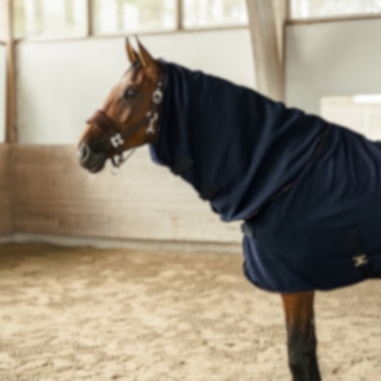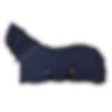 Elegant och smidigt marinblått fleecetäcke med hals, dekorerat med stilfull brun passpoal. Slät utsida, mjukt flossad fleece på insidan som transporterar bort fukten ifrån hästen och lägger det på utsidan av täcket. Funktionella kryssgjordar samt svansrem. Frontspänne med karborr. Perfekt för egen brodyr.