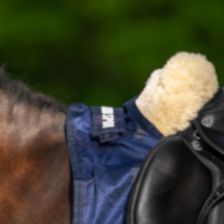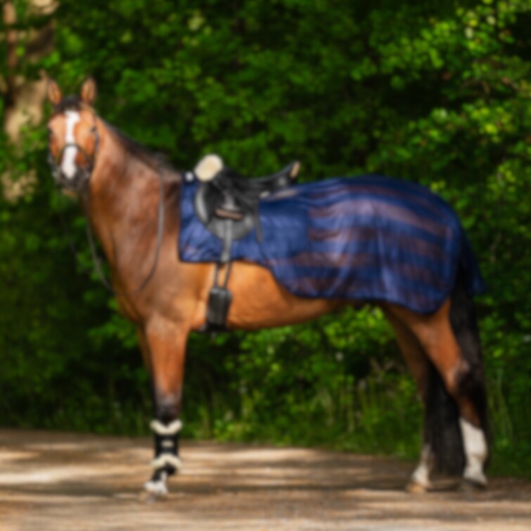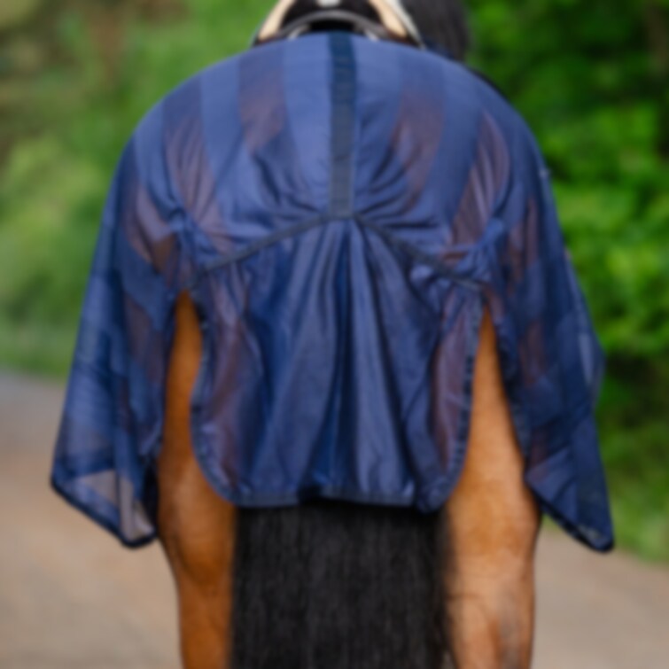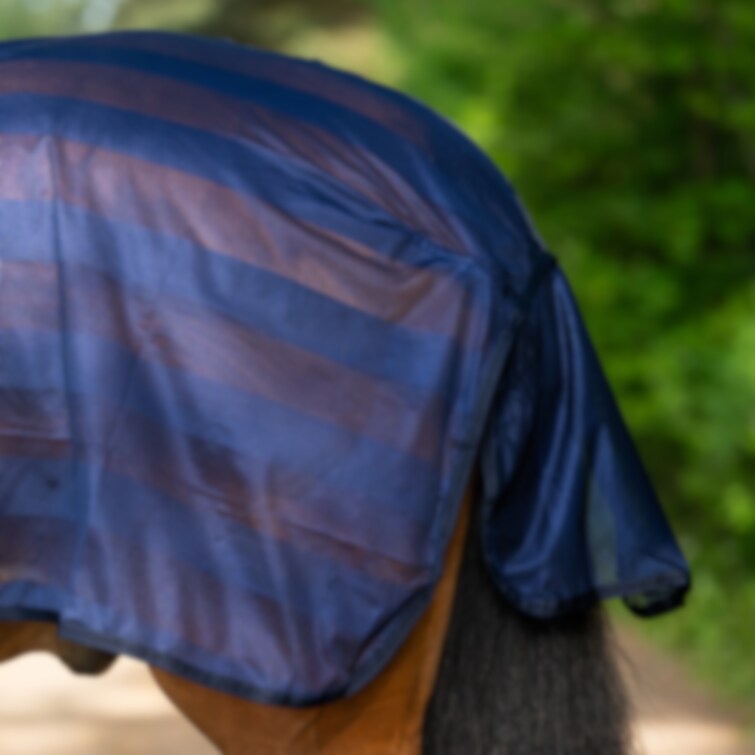 Det klassiska ridflugtäcket i smidigt polyestermesh erbjuder ett effektivt skydd mot insekter under ridning. Täckets vertikala, ton-i-ton färgade ränder ger en fin detalj och ett snyggt och diskret uttryck. Den konturskurna passformen runt sadeln samt utrymmet för skänklarna säkerställer god rörelsefrihet och optimal komfort för hästen. Svansremmen håller flugtäcket på plats och förhindrar att det blåser upp under ridning. Dessutom är det utrustat med ett stort svansskydd och kardborreband som knäpps framför framvalvet på sadeln för enkel fastsättning och stabilitet. Användningsbart vid ridning i insektsutsatta miljöer för att minimera irritation och stress hos hästen.