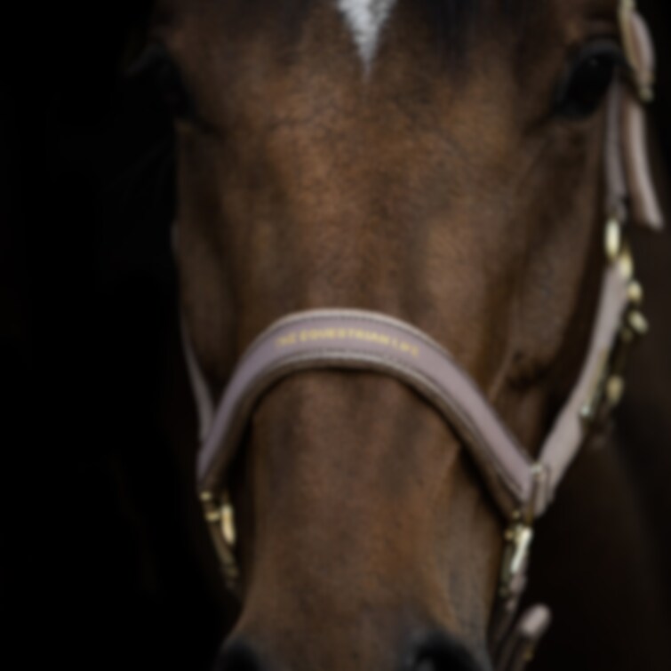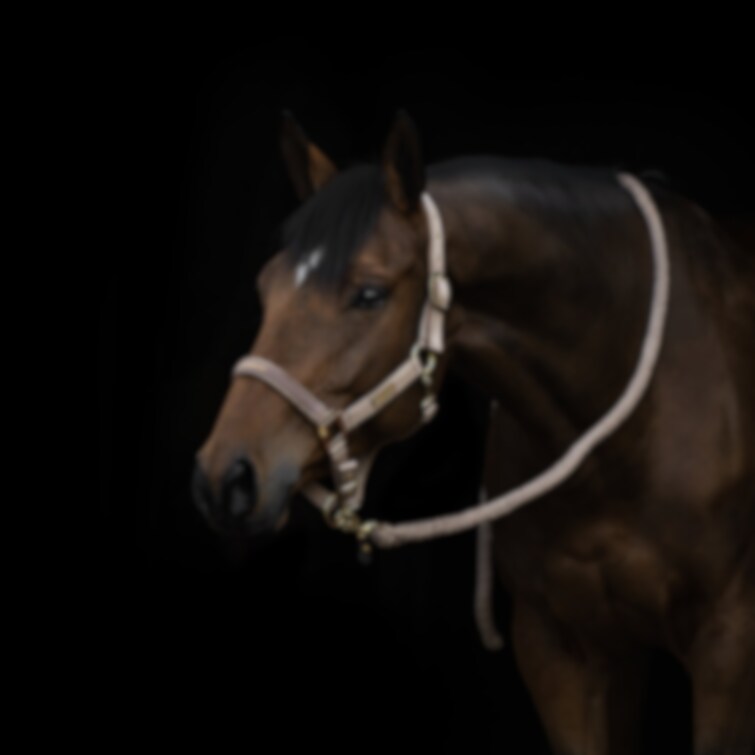 Textilgrimma fodrad med mjuk frotté över nacken och över nosen. Vackert guldfärgad HANSBO SPORT-plakett på sidan. Guldfärgade metallbeslag samt vävd logga över nosryggen ”Designed For Equestrian Life”.