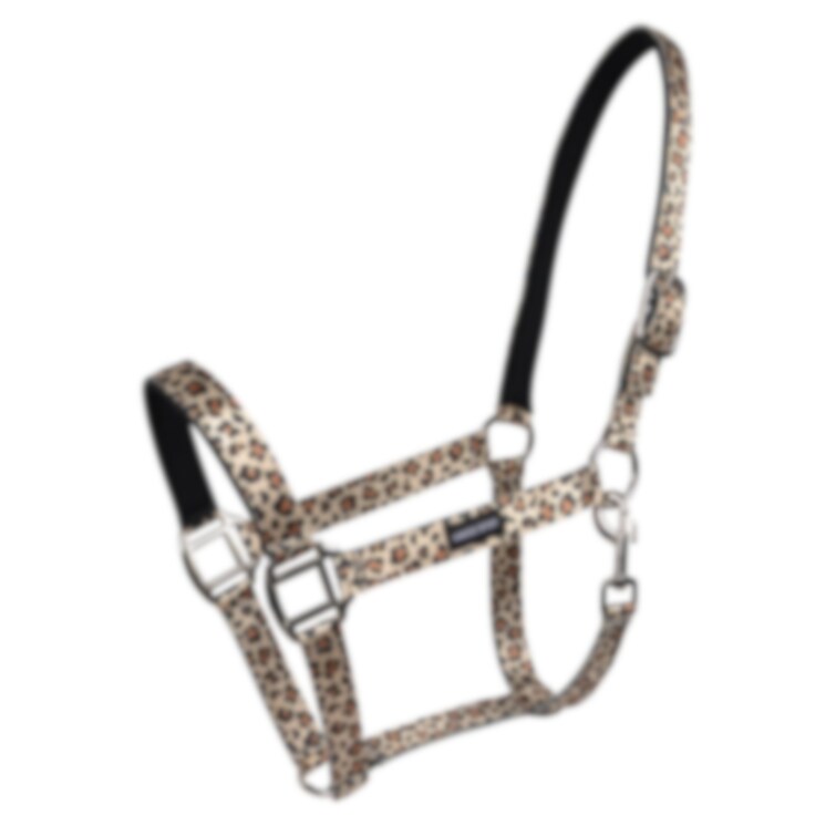 Lekfull grimma med leopardmönster. Designad med silverfärgade spännen samt fodrad med neopren. Justerbar för optimal passform.