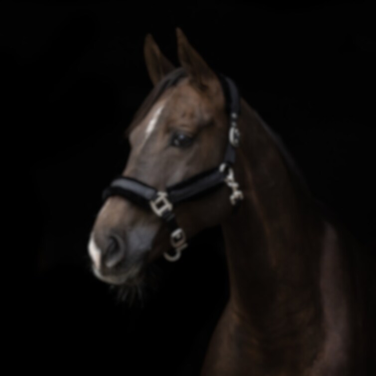 Glamorös grimma med glittriga dekorband, tillverkad av kraftig textil med mjuk syntetpäls i nacke, nos och på sidostyckena. Justerbar för optimal passform.