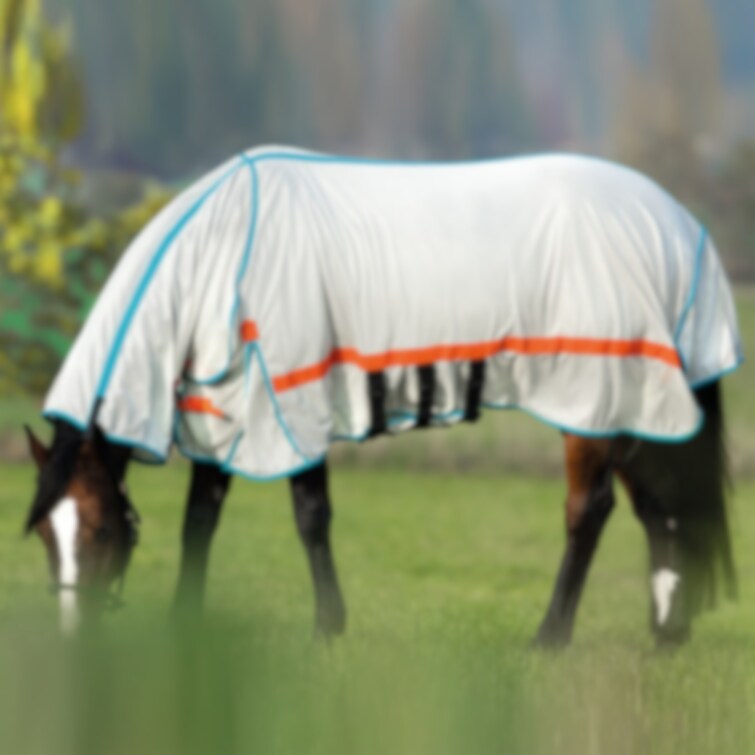 Flugtäcke i 100% polyester i silverfärgad mesh med dekorativa kantband. Nylonfodrat över bogen och svansflärpen för att motverka skav. Försett med D-ringar för ev. bensnöre. Fast kombohals som försluts med kardborre under hals och nacke.Ett frontspänne. Extra UV-skydd. Magplatta som knäpps med rejäla plastspännen. Maskintvätt i max 40 grader. Kantbanden kan dra ihop sig efter tvätt, så tänk på att sträcka det varsamt i blött tillstånd.
