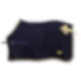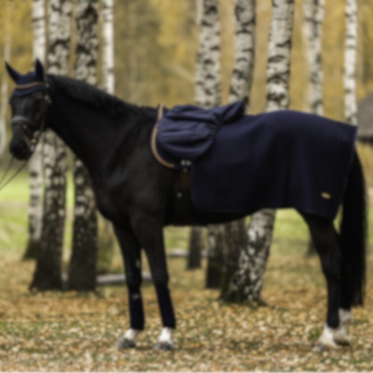 Quiltat ridtäcke i termiskt material med andasfunktion. Brun elegant detalj i kantband samt guldfärgad HS metallbricka samt avtagbar svansrem. Fästes enkelt i sadeln med kardborre.