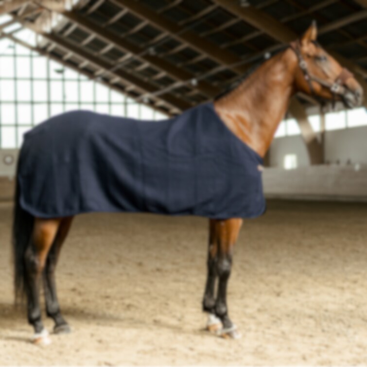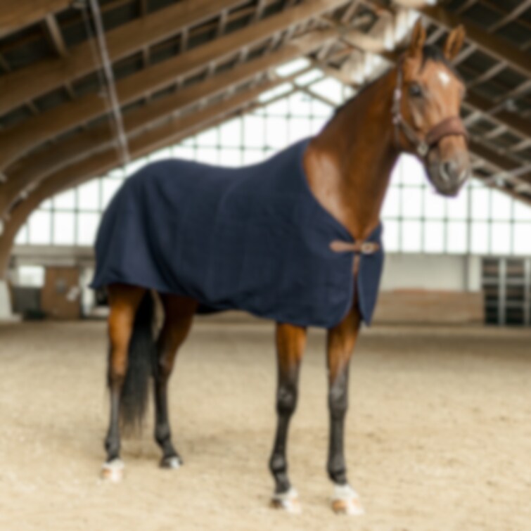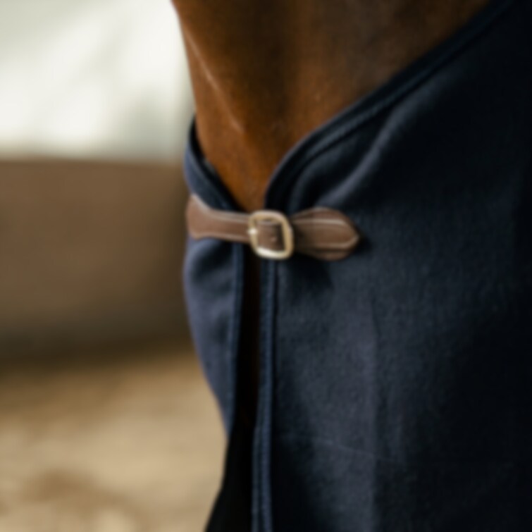 Marinblått hästtäcke tillverkad i en kraftig ullblanding som håller hästen både varm och torr. Täcket är designat med en dekorativ matchande passpoal. Avtagbara kryssgjordar samt vacker frontknäppning i läder. Optimalt för användning under framridning, efter träning eller som transporttäcke. Plats för egen brodyr. 80% ull, 20% övriga textilfibrer.