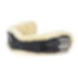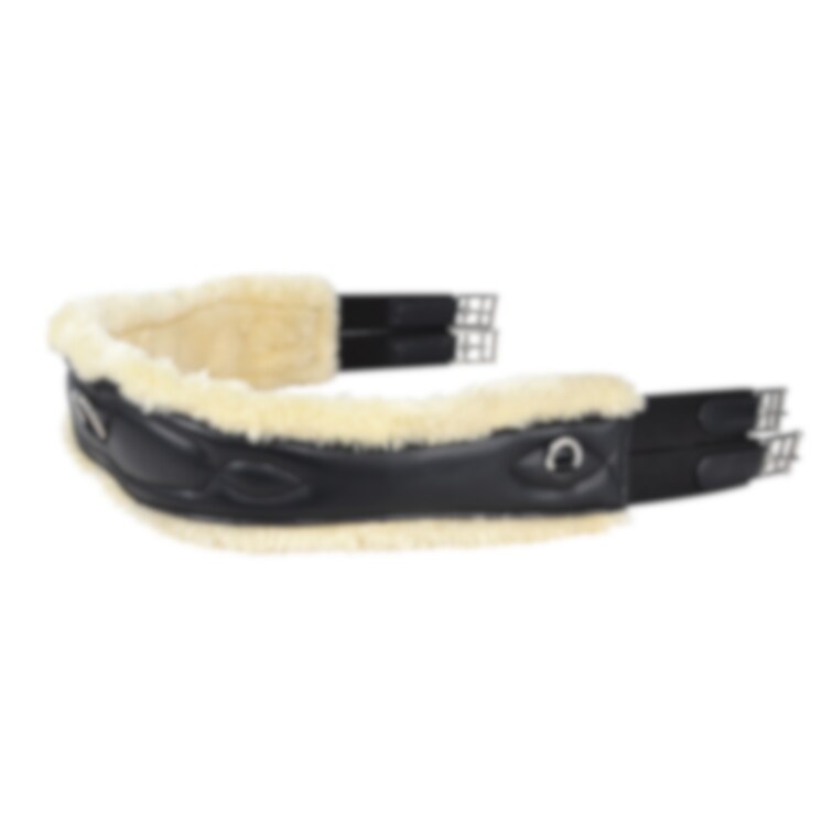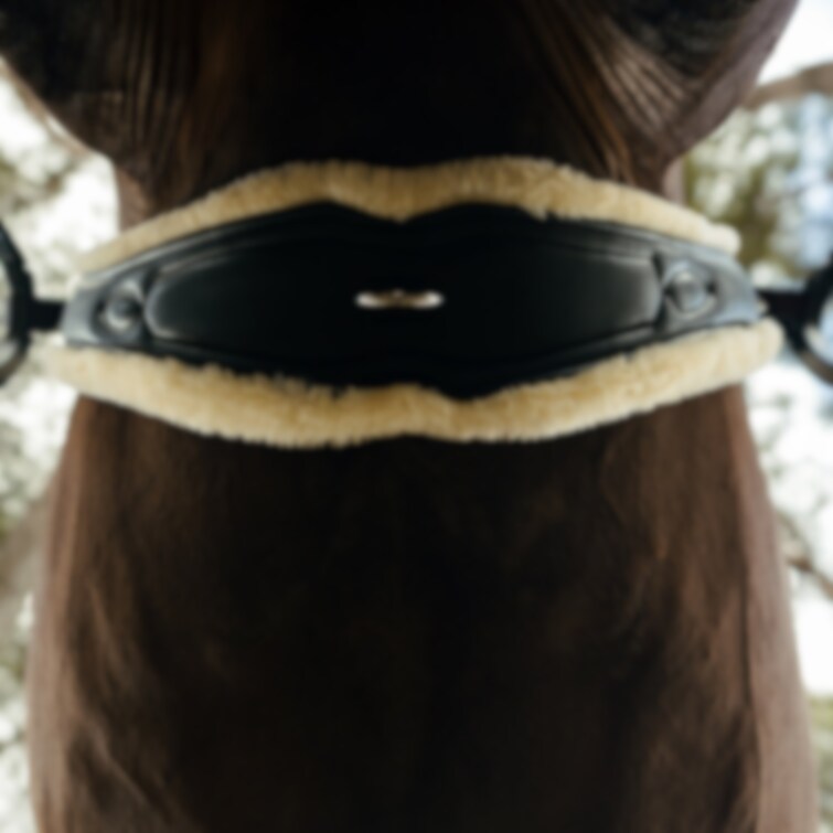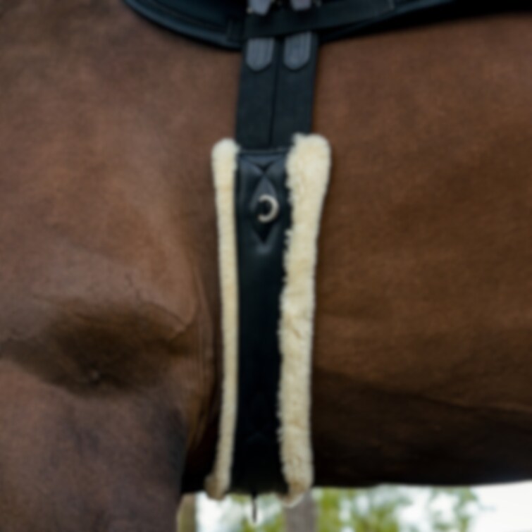 Anatomisk sadelgjord tillverkad av veganskt läder med mjukt syntetiskt/artificiellt fårskinn. Försedd med elasticitet i båda ändar samt tre stycken D-ringar för fastfästning av förbygel, martingal eller andra hjälptyglar. Den anatomiska passformen säkerställer maximal rörelsefrihet samtidigt som den supermjuka fuskpälsen minskar risken för skav och friktion. Spännen av rostfritt stål med rullar.