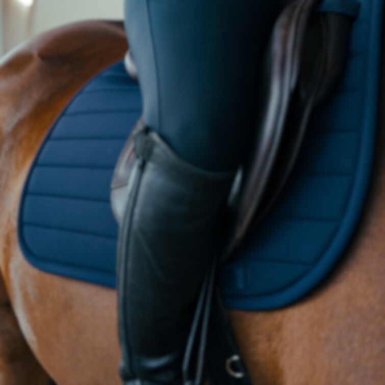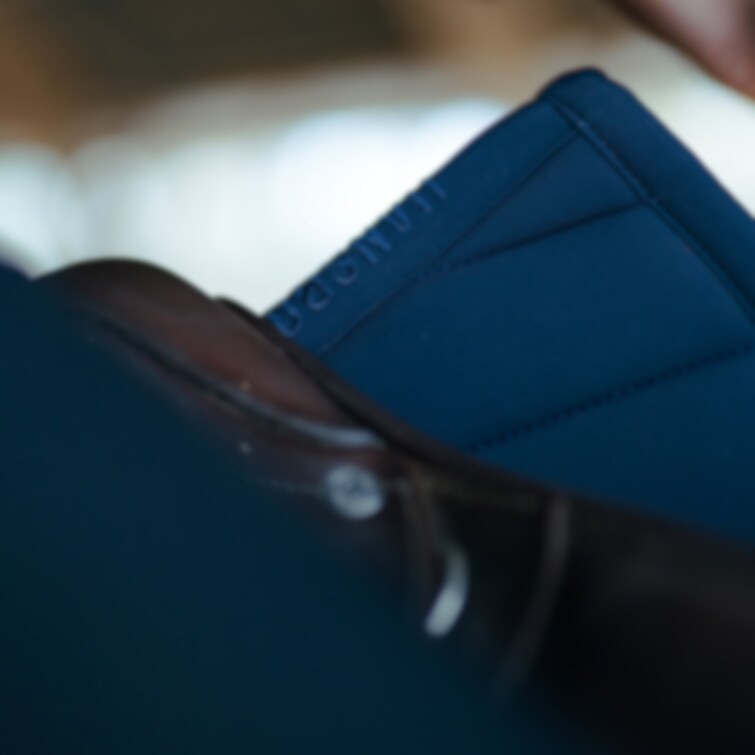 Marinblått hoppschabrak i mjuk jersey med rak quiltning. Schabraket har en voluminös vaddering för extra stötdämpning och komfort för både häst och ryttare. Modellen är anatomiskt utformad med en insida av högkvalitativt funktionsmaterial som effektivt transporterar bort fukt. Plats för egen brodyr.