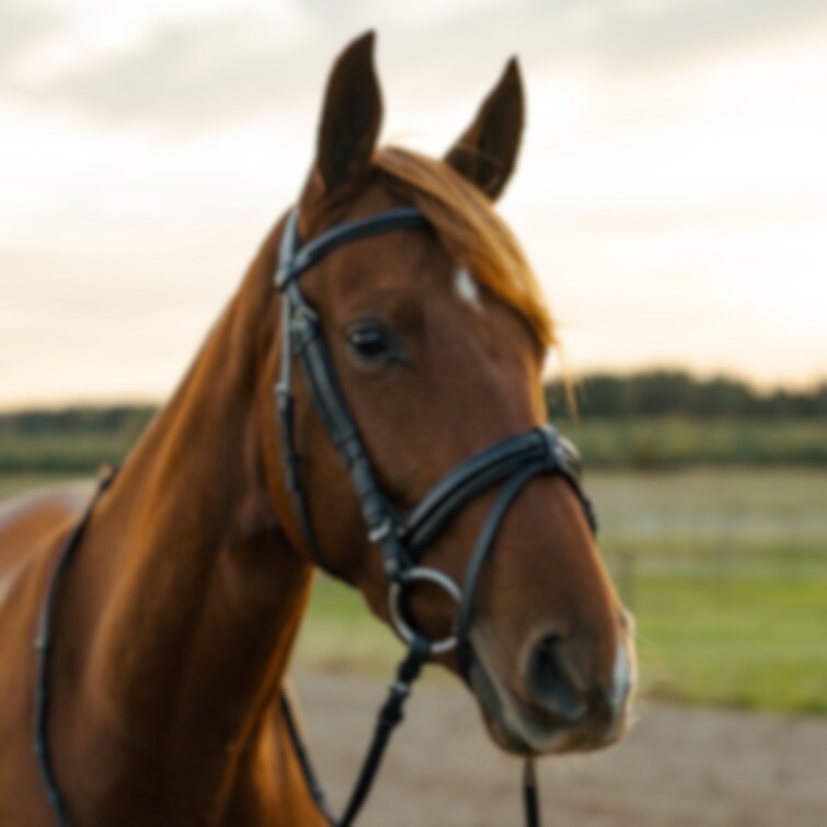 Elegant träns med ergonomiskt utformat nackstycke och aachennosgrimma. Tillverkat av högkvalitativt mjukt läder. Fodrad nosgrimma och nackstycke, med lackad detalj för lyxig modern look. Silverfärgade spännen. Säljes utan tyglar.
