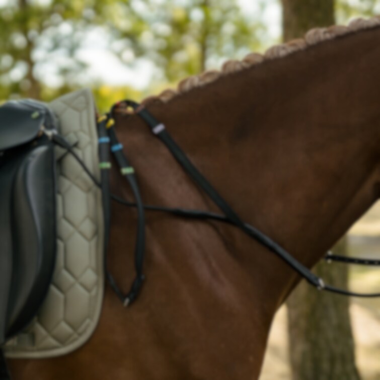 Funktionell hjälptygel som kombinerar halsrem och förbygel, där alla remmar är justerbara och avtagbara för maximal anpassning. Hjälptygeln fästs enkelt i sadelns D-ringar med pistolhakar och i sadelgjorden för extra stabilitet. Handtaget ger ett extra grepp vid behov. Hjälptygeln kan ge ökad stabilitet vid exempelvis träning av unghästar och ge extra stöd för osäkra ryttare. En flexibel och användarvänlig lösning för olika behov.