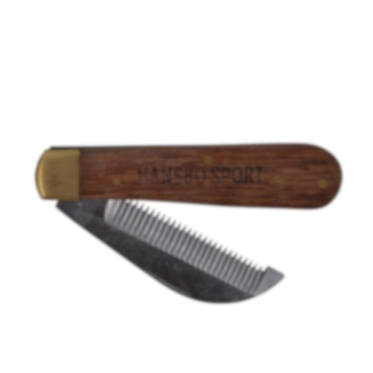 Klassisk hopfällbar trimkniv med trähandtag. Perfekt för hästar och hundar som inte tycker om att bli ryckta.