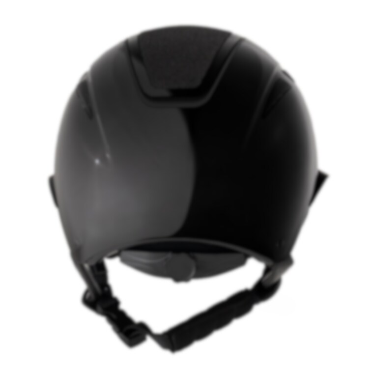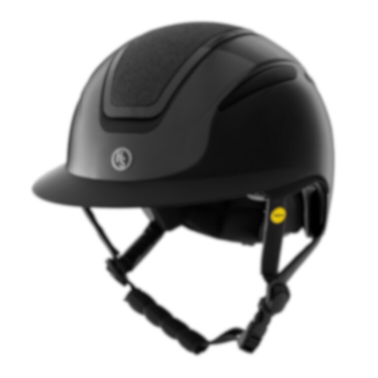 Ridhjälm med implementerat Mips-system. Elegant bred, matt solskärm, glittrande panel kantad av en stilfull cromad ram i symbios med matt omringande detalj. Designad med fyra funktionella ventilationsöppningar. Justerbart hakband med detaljer av syntetiskt läder och praktiskt snabbspänne. Avtagbart vadderat innerfoder av Cooldry-material, torkar snabbt och håller huvudet svalt under hela ridpasset. Justerbart huvudband för optimal passform.