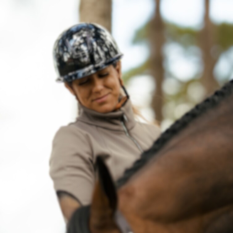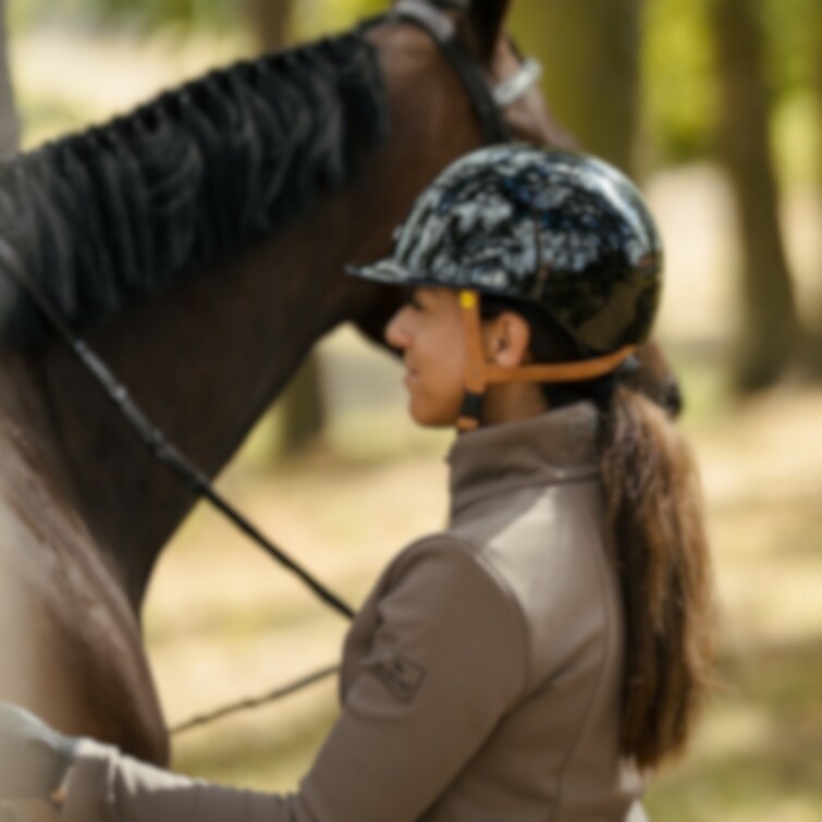 Ridhjälm med implementerat Mips-system. Elegant glansig hjälm med bred solskärm, glansig panel omringad av diskret glitter. Designad med totalt sex ventilationsöppningar. Justerbart hakband i exklusivt brunt konstläder med trepunktsfästen samt snabbspänne. För optimal passform justeras storleken enkelt baktill med hjälp av rattsystemet. Avtagbart innerfoder av Cooldry-material, som torkar snabbt och håller huvudet svalt. Tillverkad av premium polykarbonat.