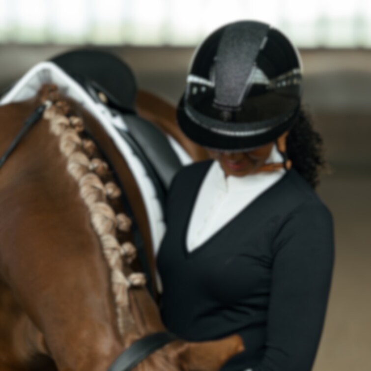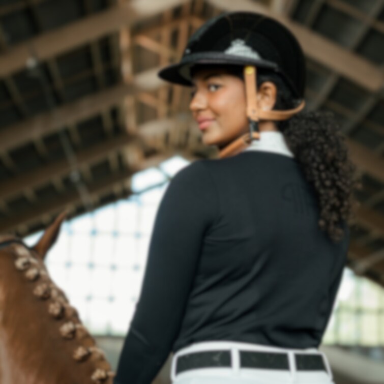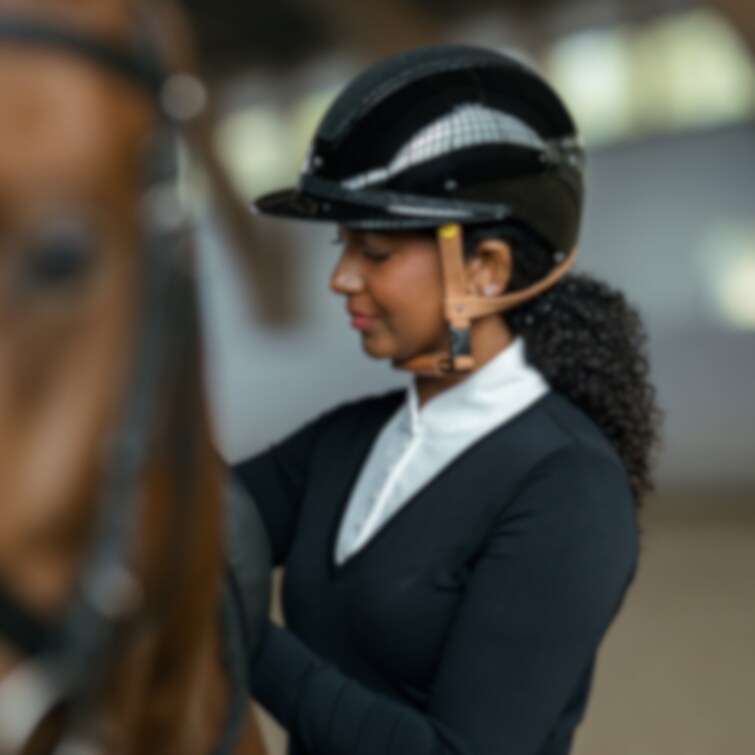 Ridhjälm med implementerat Mips-system. Elegant glansig hjälm med bred solskärm och gnistrande glittrande panel samt vackert glitterband runt skärmen. Designad med totalt sex ventilationsöppningar. Justerbart hakband i exklusivt brunt konstläder med trepunktsfästen samt snabbspänne. För optimal passform justeras storleken enkelt baktill med hjälp av rattsystemet. Avtagbart innerfoder av Cooldry-material, som torkar snabbt och håller huvudet svalt. Tillverkad av premium polykarbonat.