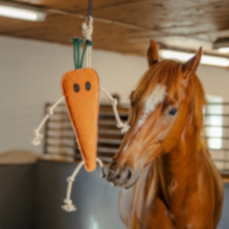 Leksak/gosedjur till häst. Morot tillverkad av mocka och fylld med Kokosnötsfiber. Optimal för hästar som lätt blir rastlösa i boxen, då denna kan hjälpa till att sysselsätta hästen och motverka tristess. Enkel att hänga upp.