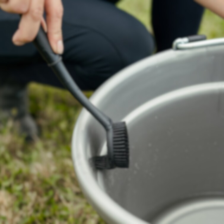 Svart gummidiskborste, speciellt anpassad för rengöring av hinkar och baljor. FOrmen på borsten gör det enkelt att komma åt i och runt kanter som annars kan vara svåråtkomliga med en vanlig diskborste. Borsten har kraftiga och flexibla borststrån i slitstarkt gummi som effektivt tar bort smuts, foderrester och beläggningar. Enkel att skölja av och hålla fräsch då avståndet mellan borststråna gör de enkelt av avlägsna envisa höstrån som kan fastna vid användning. Handtaget är greppvänligt med ett hål för upphängning.